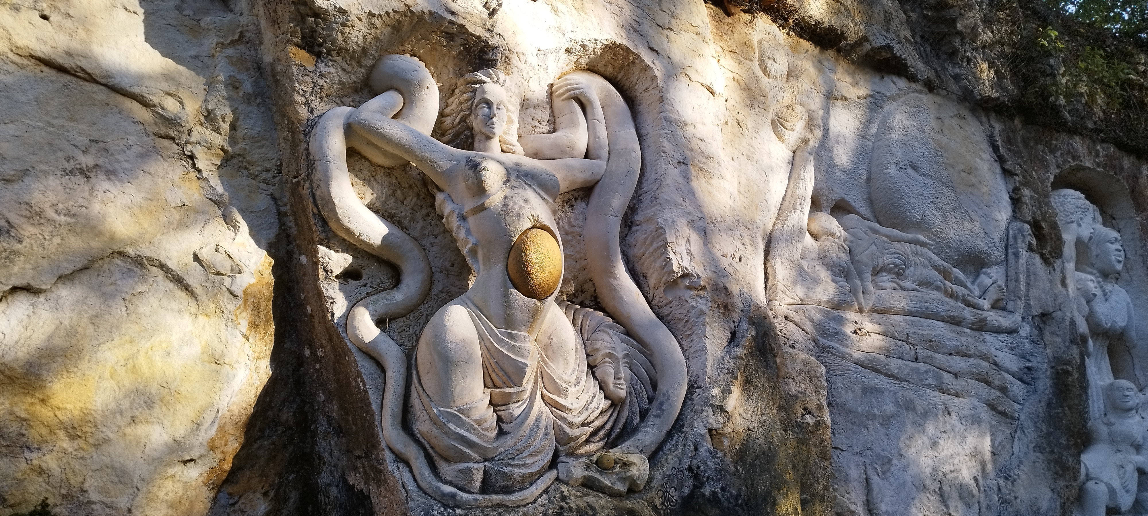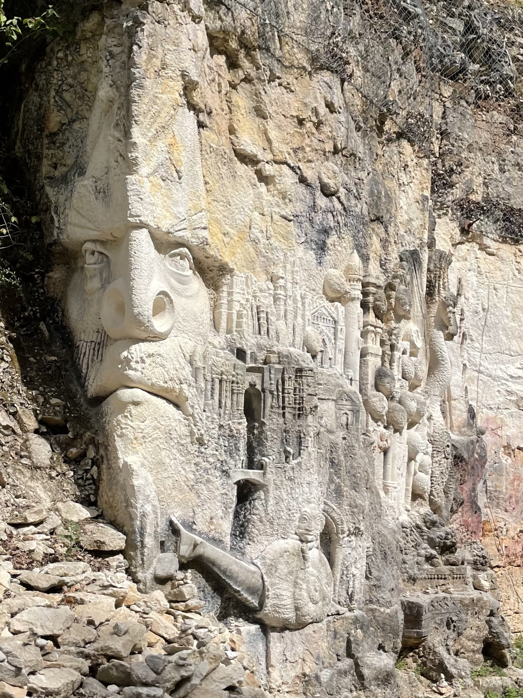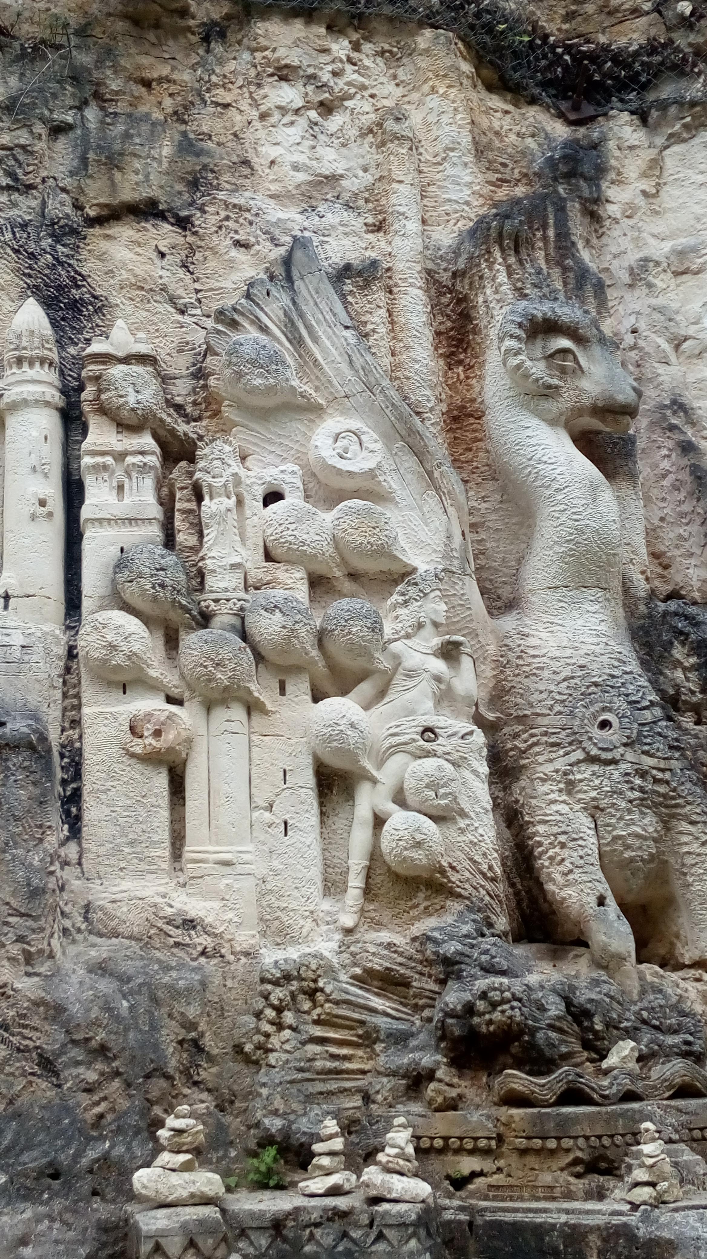 Site de sculpture de thèmes très divers, avec passage sous une grande voute et une immense frise sculpté à même la paroi, c'est magnifique, accessible facilement et gratuitement