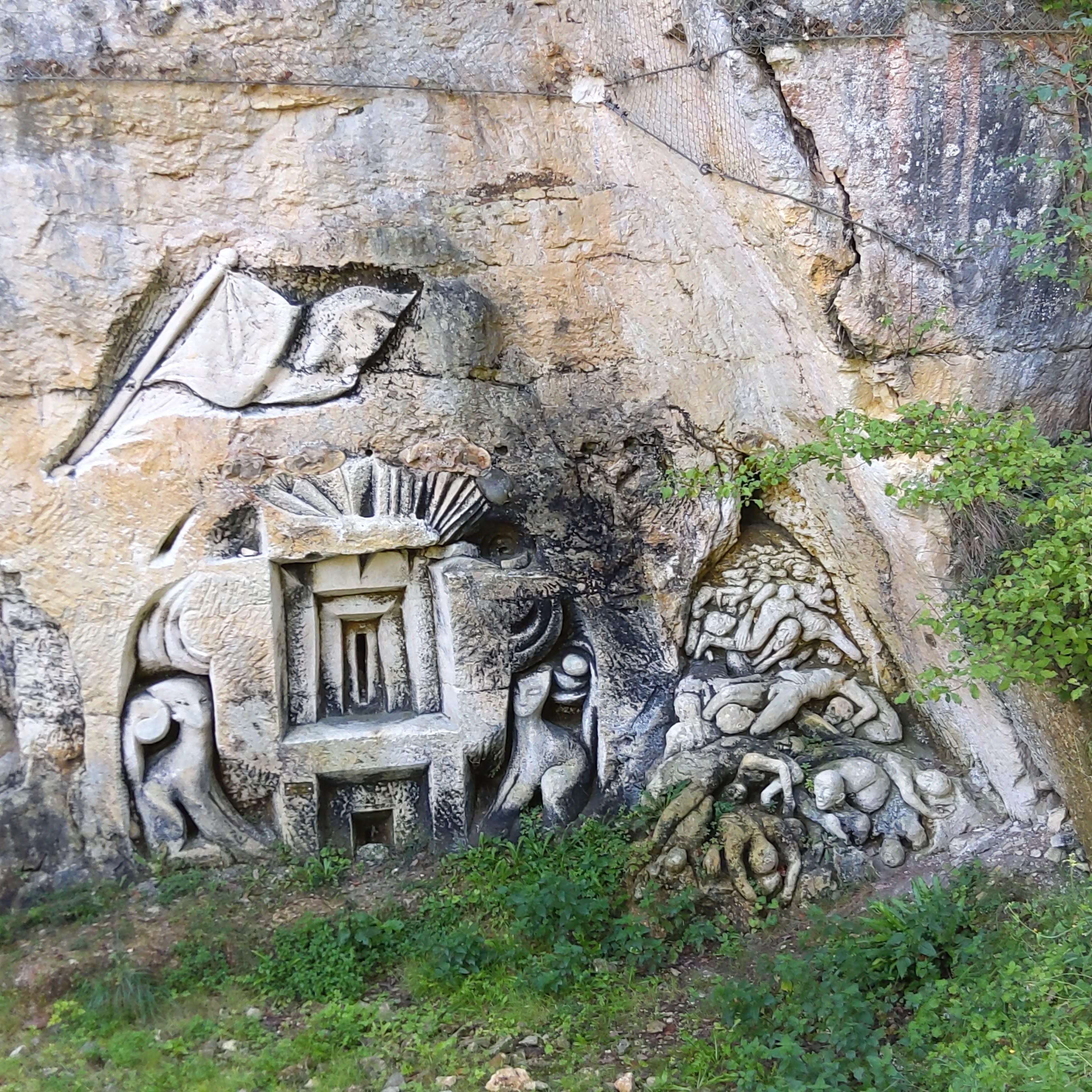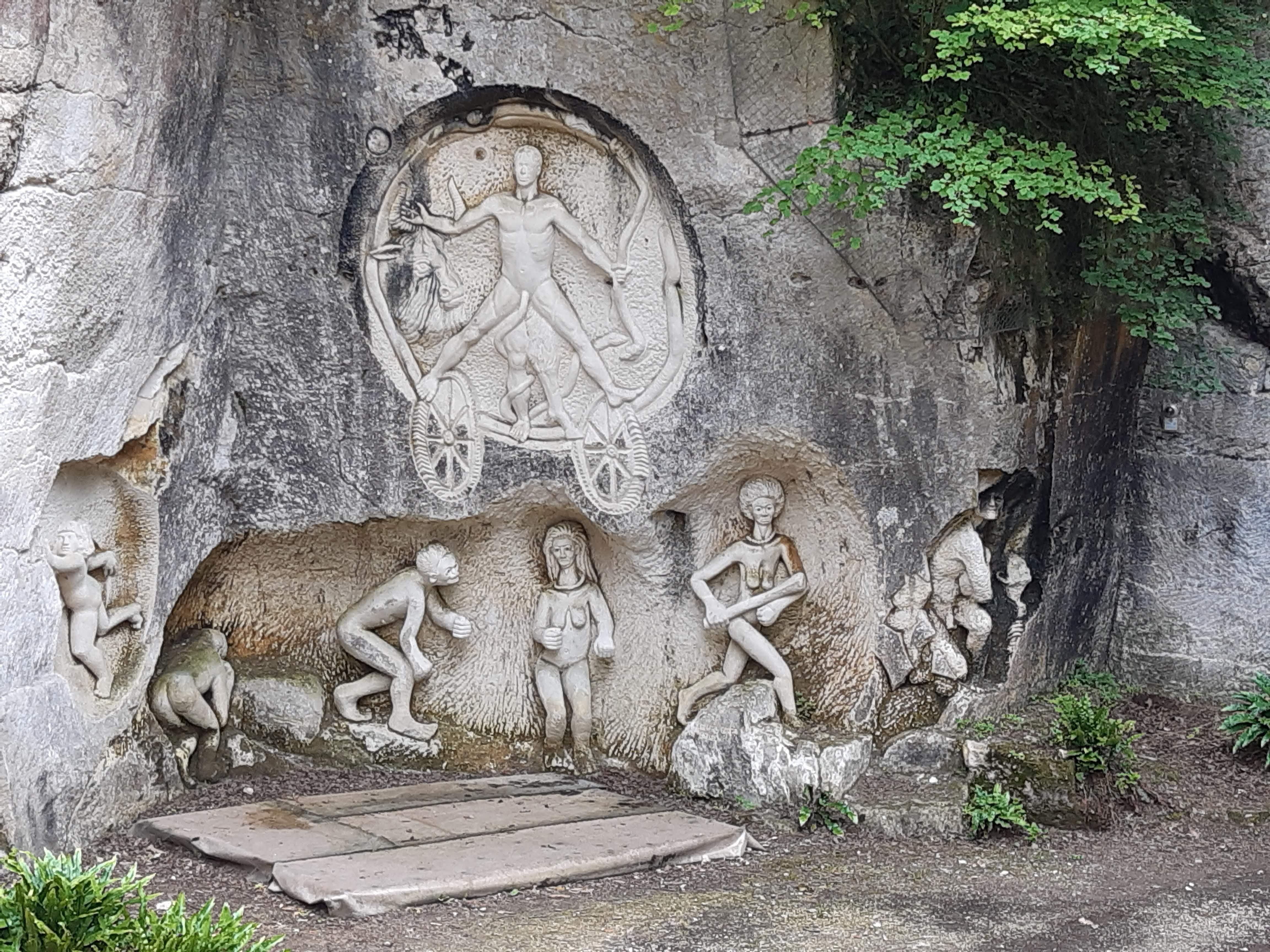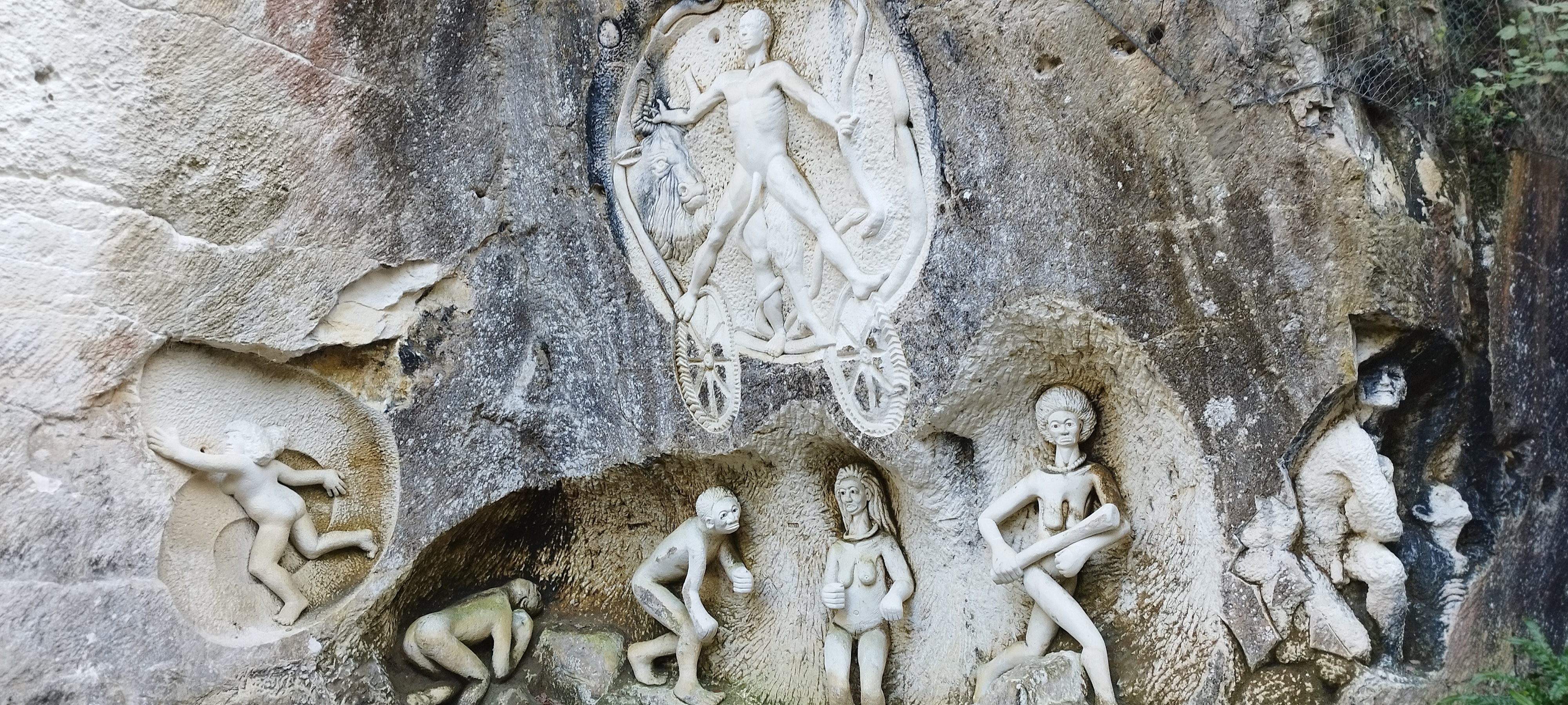 Site de sculpture de thèmes très divers, avec passage sous une grande voute et une immense frise sculpté à même la paroi, c'est magnifique, accessible facilement et gratuitement