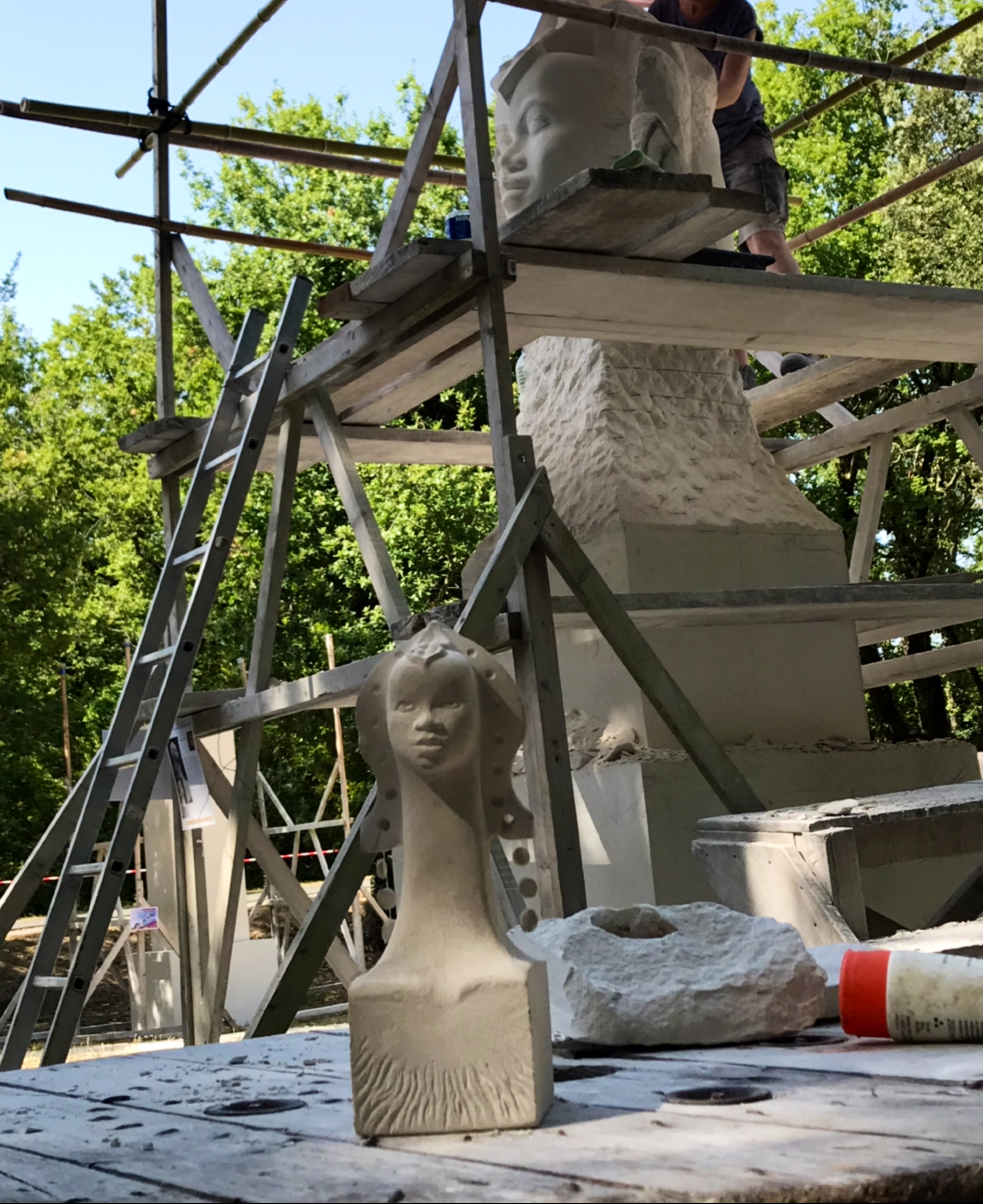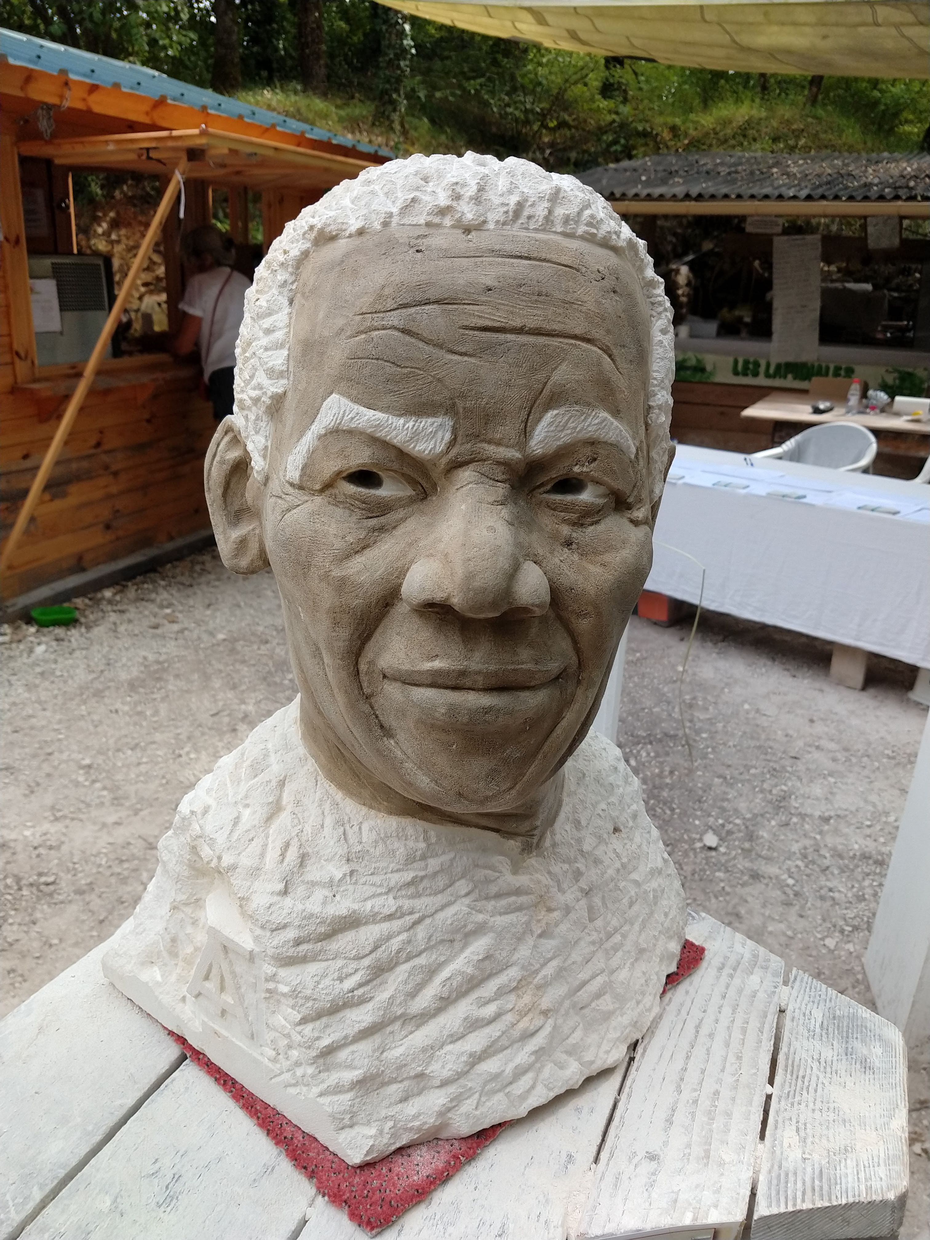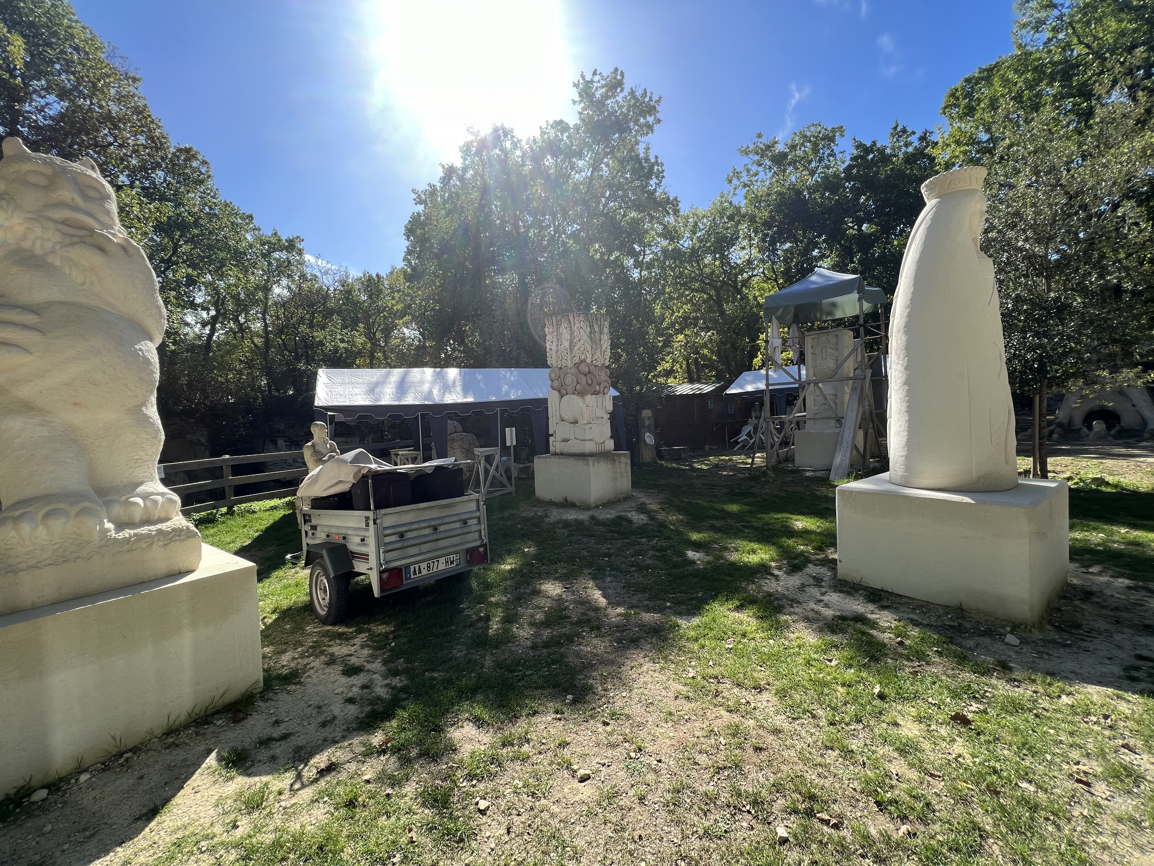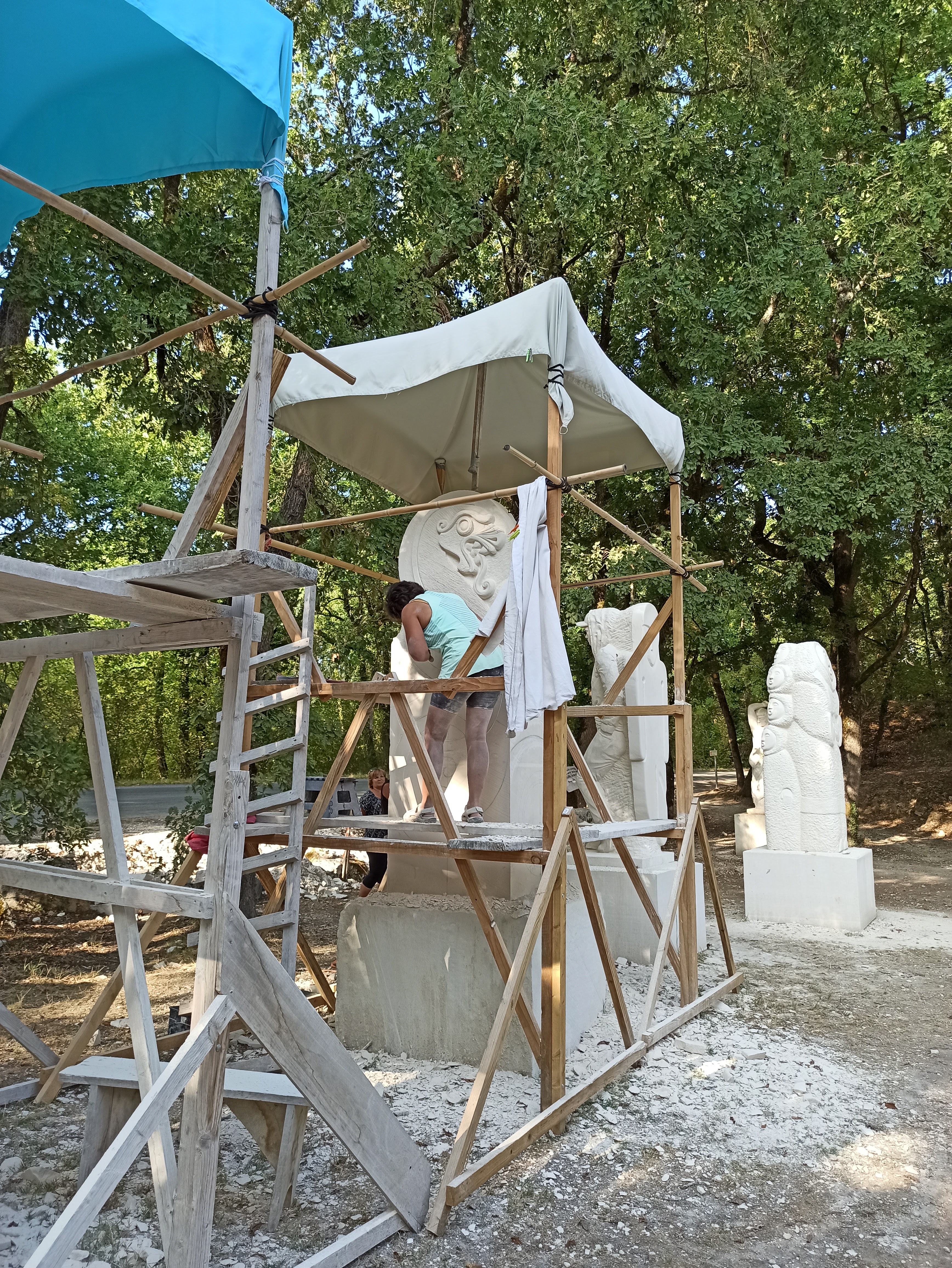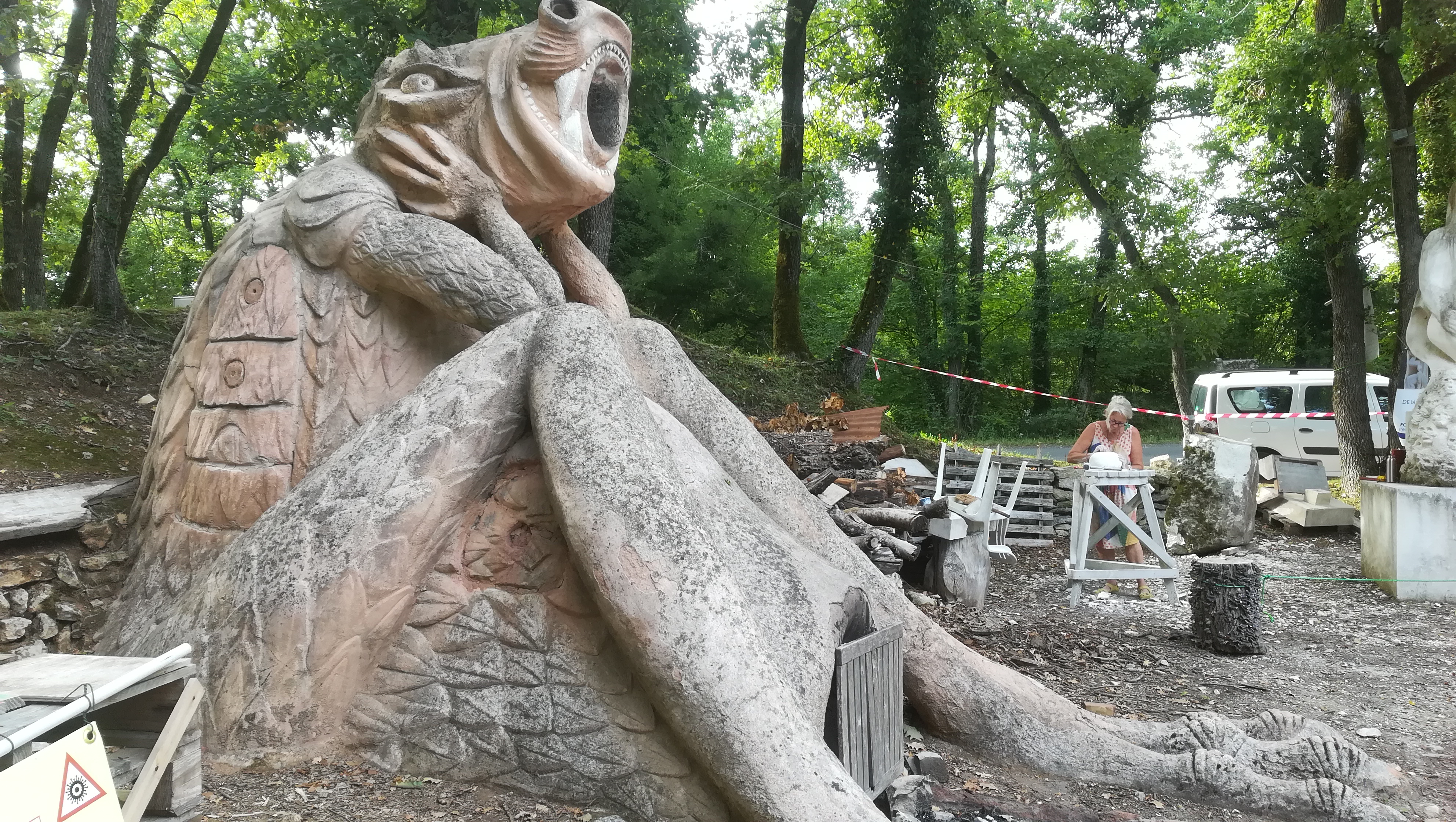 Très belles sculptures en réalisation et ambiance conviviale, lieu frais et ombragé