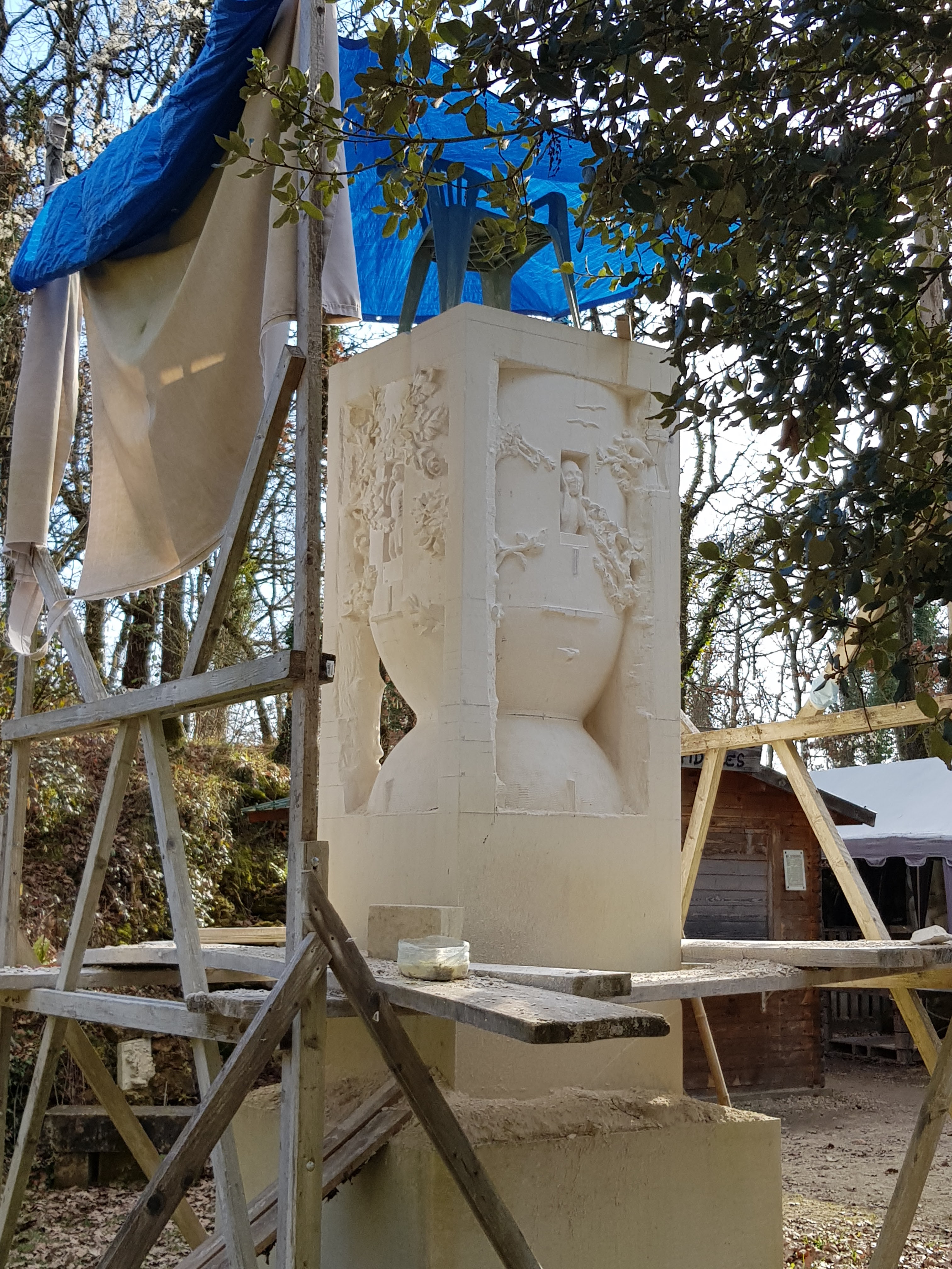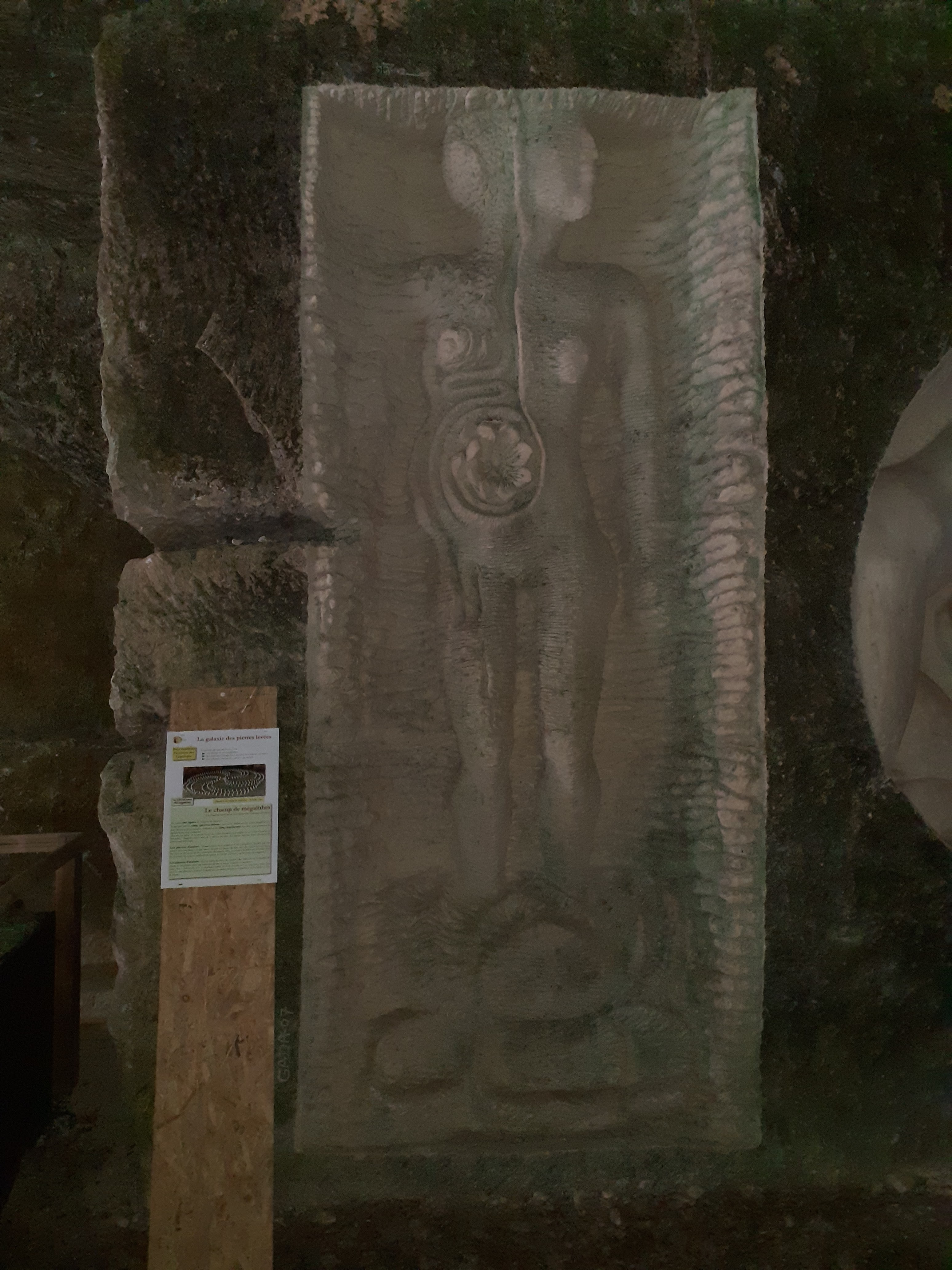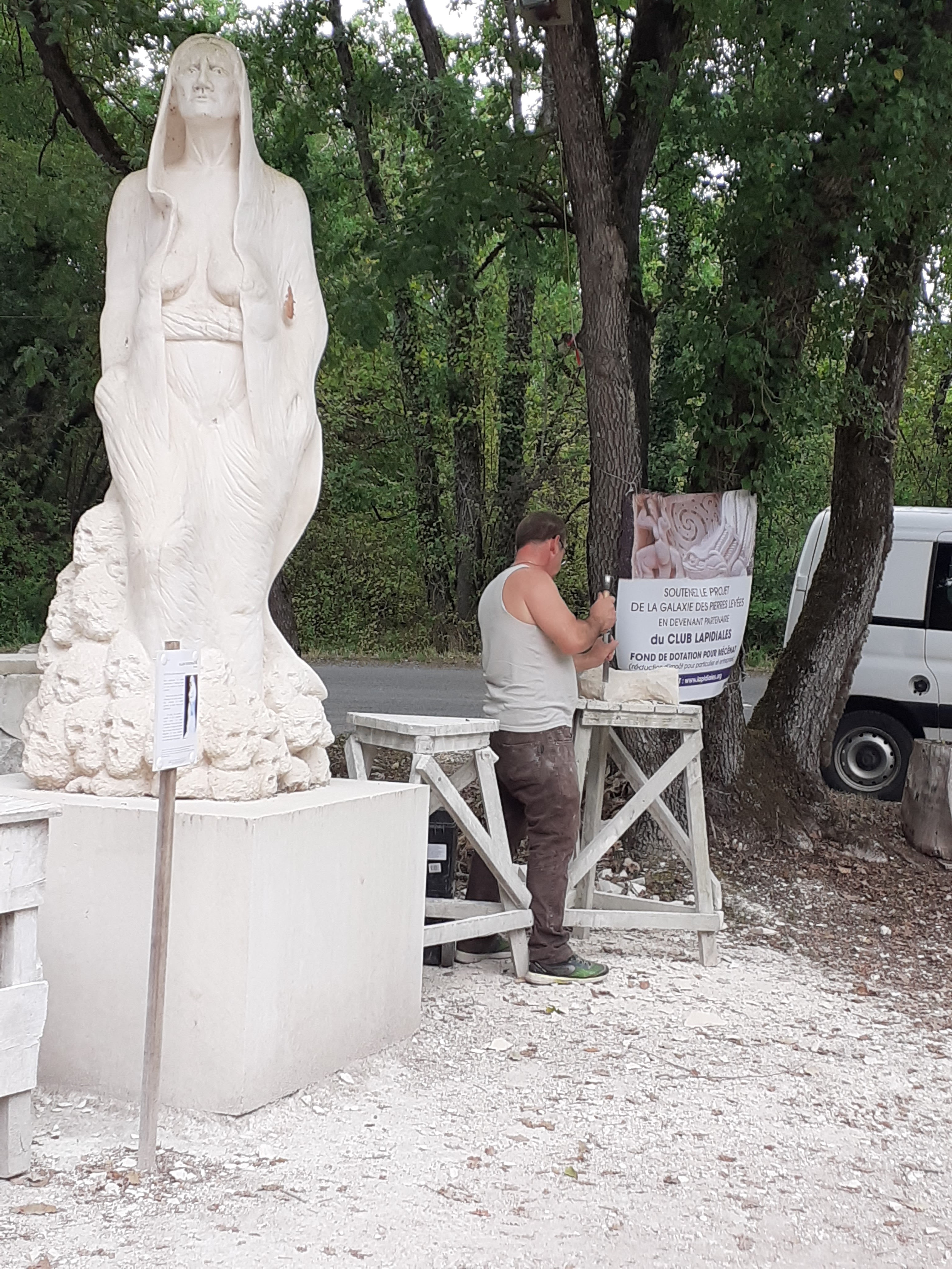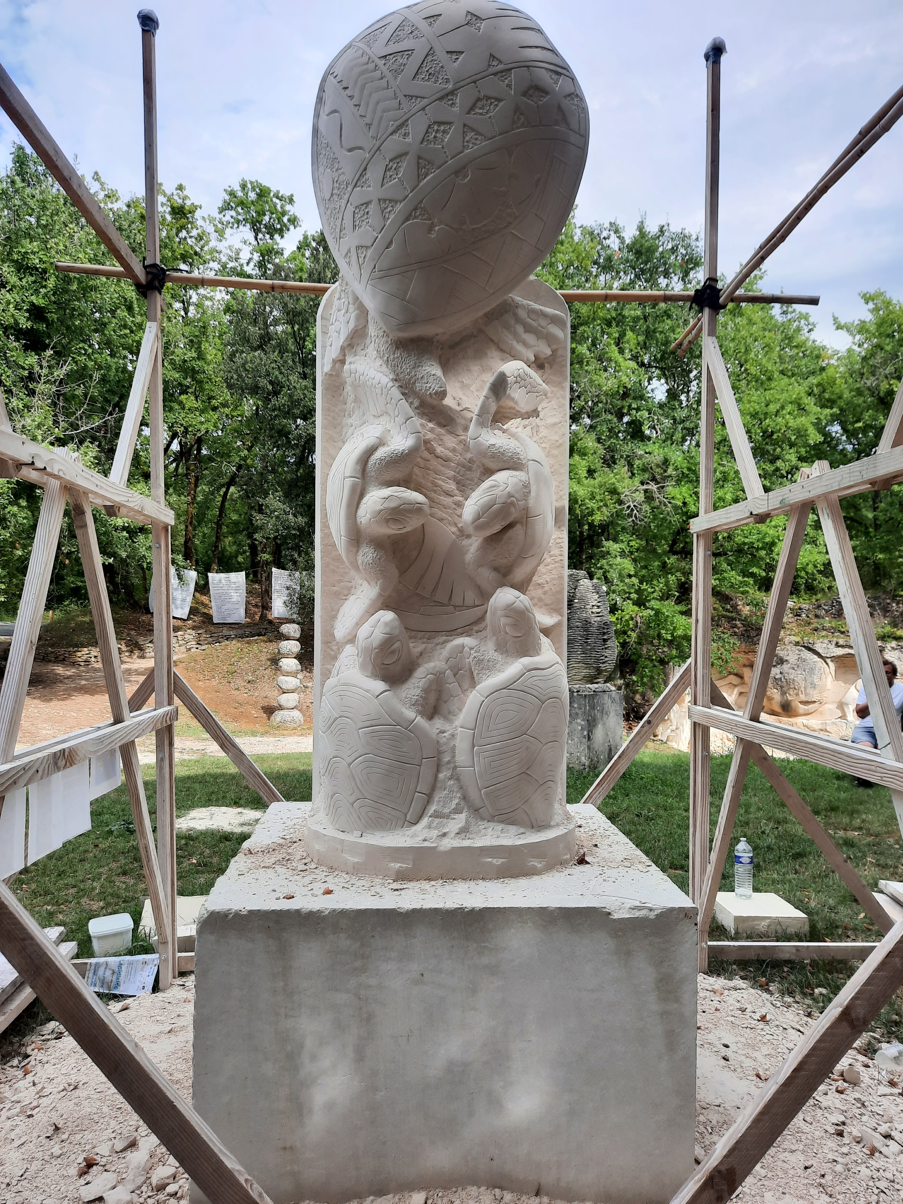 Sculptures directement dans la roche, pour les nouvelles ce sont des blocs préparés qui sont taillés sur place pour être ensuite exposées à la Galaxie des Pierres Levées. Superbe